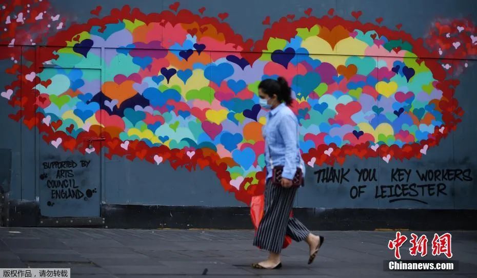 当地时间6月29日,英国莱斯特市中心,行人走过一幅为感谢疫情中做出贡献的工作人员而作的壁画。