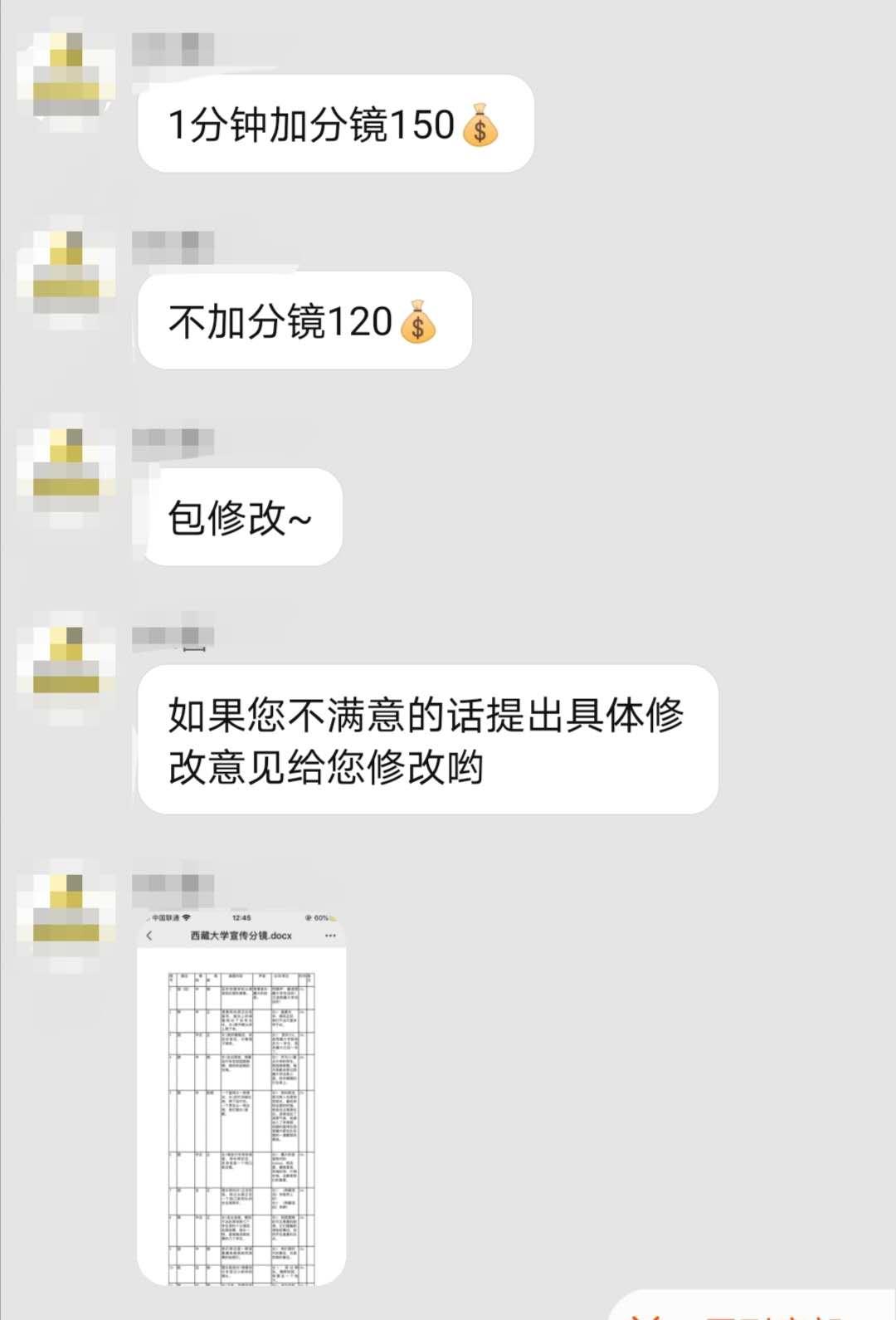 “一分钟的本子我需要写1300-3000字,跟拍的话,一分钟的视频要拍八个小时。要价太低,别人会当咱们是廉价工种的。”