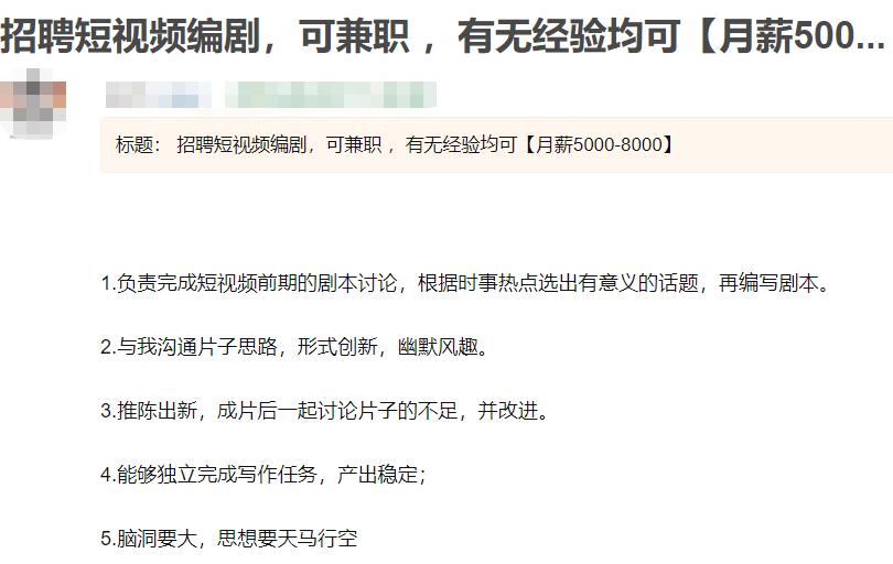 在豆瓣等论坛,短视频编剧的招聘启事很多,往往标注90后团队、有无经验均可、月薪5-8k、接受兼职等诱人条件,但是很多联系上以后都说:“对不起我们现在不需要了。”