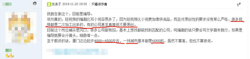 另外资深短视频编剧也提到,全职做短视频编剧,只要能写短故事,入门也可以拿到月薪4k-6k的水平,熟练的8k-12k没有问题,拓展业务靠人脉,也要靠自己去挖掘。