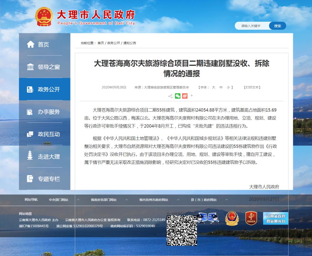 据云南省大理市人民政府网站9月28日消息,大理市政府27日发布《大理苍海高尔夫旅游综合项目二期违建别墅没收、拆除情况的通报》称,经研究,决定对已没收的大理苍海高尔夫度假村有限公司55栋违建建筑物予以拆除。
