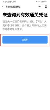 (3) 如出现“未查询到有效通关凭证”,请选择“去转码”,并在澳门健康码内选择“下载个人资料申领粤康码”。