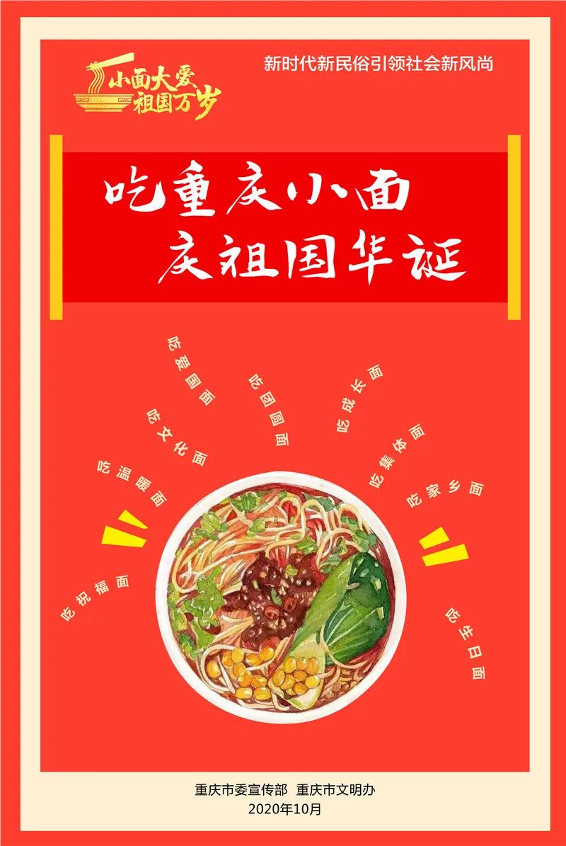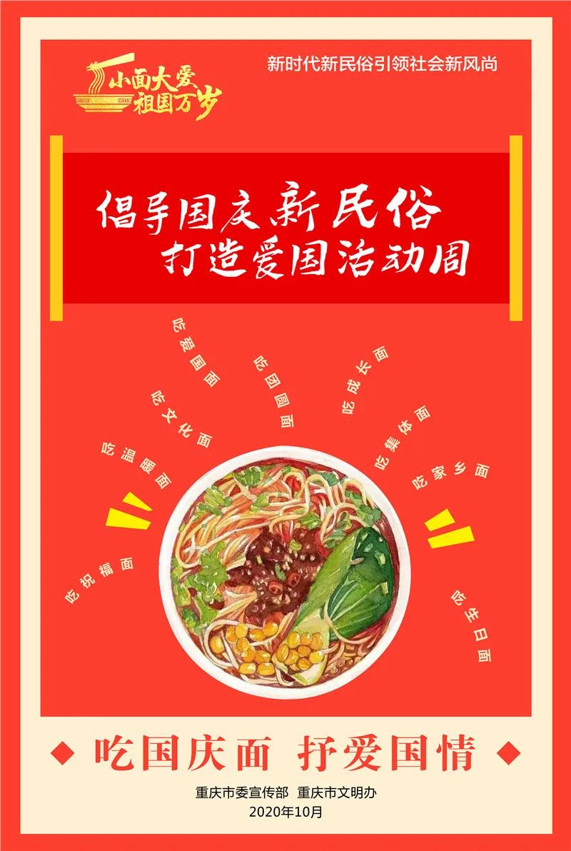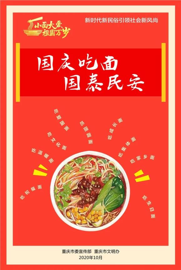 国庆节即将到来,为庆祝新中国成立71周年,九龙坡区将在全区开展“国庆吃面 国泰民安”倡导国庆新民俗示范活动,区委宣传部联合全区13家餐饮企业,推出“吃重庆小面 庆祖国华诞”活动。