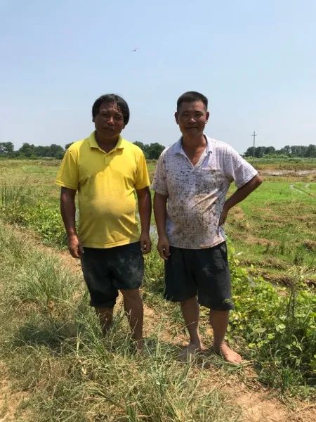 种粮大户文新华(左)在田间地头接受采访。湿谷市场收购价高低不等,高的八毛多一斤,低的六毛多一斤。文新华家大部分湿谷卖的是六毛五一斤,总共卖了两万多块钱。即便如此,文新华也未及时拿到卖粮钱。