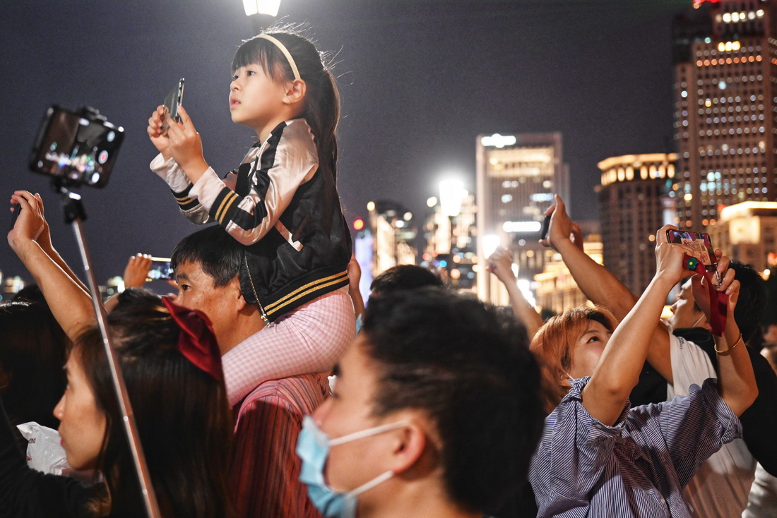 (点击看高清大图)9月30日晚,上海外滩,浦江光影秀吸引大批游客前来观看。 本文图片均为 澎湃新闻记者朱伟辉 图