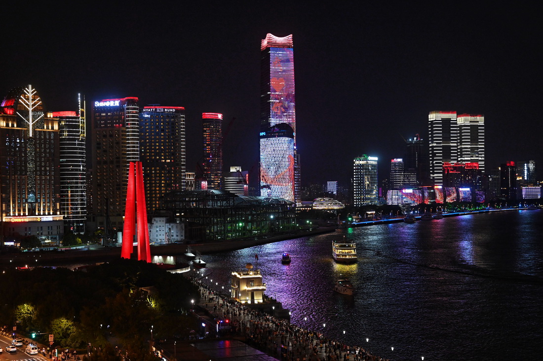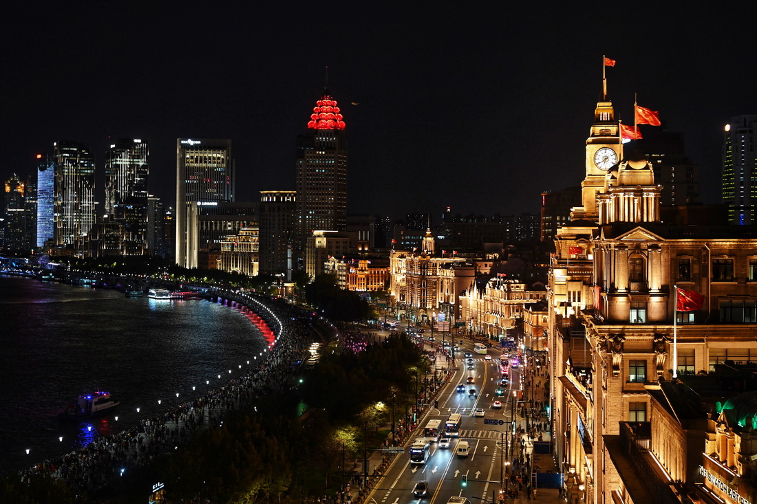 人民英雄纪念碑身披“红衣”,北外滩建筑群灯光璀璨。