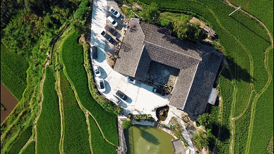 蓝天下院坝干净、茅房竹篱、亭阁鱼池