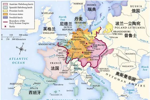 紧接着,新教的英国、瑞典,天主教的波兰,东正教的俄国都被卷入战争。不过,宗教也不是唯一区分敌我的标准,法国是天主教国家,却加入了新教联盟。因为法国人不愿意看到德意志有统一的趋势,占有优势的哈布斯堡和天主教诸侯便成了法国人打击的对象。