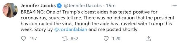爆料:特朗普亲密女助手感染新冠。特朗普回应:正在接受检测彭博社白宫记者詹妮弗·雅各布(Jennifer Jacobs)刚刚在推特上发文透露一则消息,她称特朗普最亲密的助手之一霍普·希克斯感染新型冠状病毒。