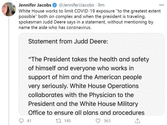 就在刚刚,詹妮弗·雅各布在最新更新的一条推特上写道:“白宫发言人朱德·迪尔在一份声明中表示,白宫致力于‘最大限度地’限制在总统外出时接触到新冠病毒,但没有提到感染新冠的助手的名字。”↓