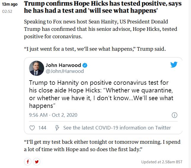 《卫报》直播消息截图特朗普说:“我只是去做了个检测,我们将看看会发生什么。”此外,特朗普还表示,“我将在今晚或明早拿回我的检测(结果)。我和第一夫人与霍普在一起待了很长时间”。