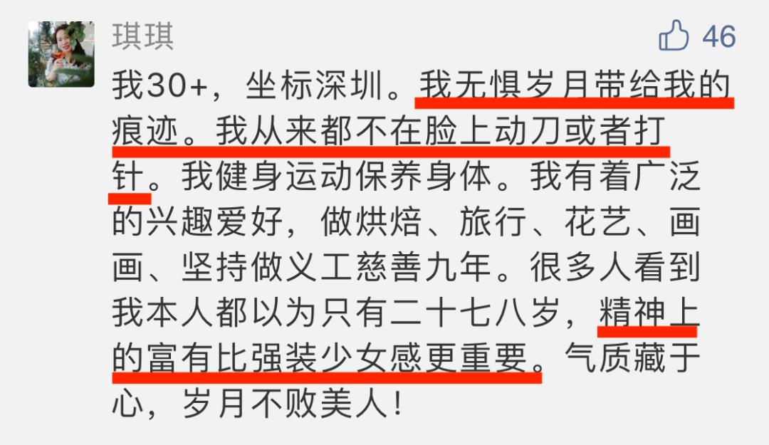 网友@琪琪说,她30+,欣然接受岁月留在脸上的痕迹。不动刀,不打针。平时健身运动、烘焙、旅行、画画、做义工……