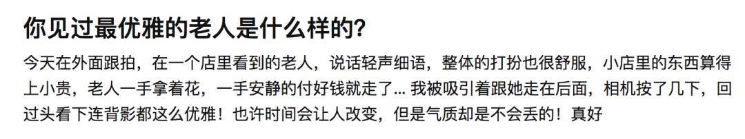 知乎上有网友说,他在花店看到一位老人,说话轻声细语,打扮得体舒适。付完钱,老人拿着花安静地走了,连背影都十分优雅。