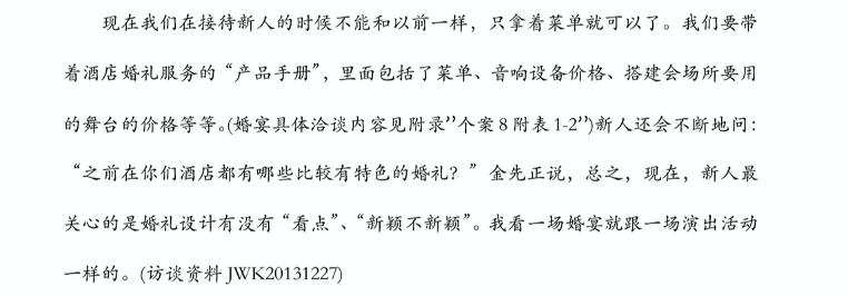 有研究者采访过上海某酒店的婚宴部经理,这位从事婚礼行业多年的经理就表示,现在新人最关心的是婚礼设计有没有“看点”、“新颖不新颖”,看一场婚宴就跟一场演出活动一样的。