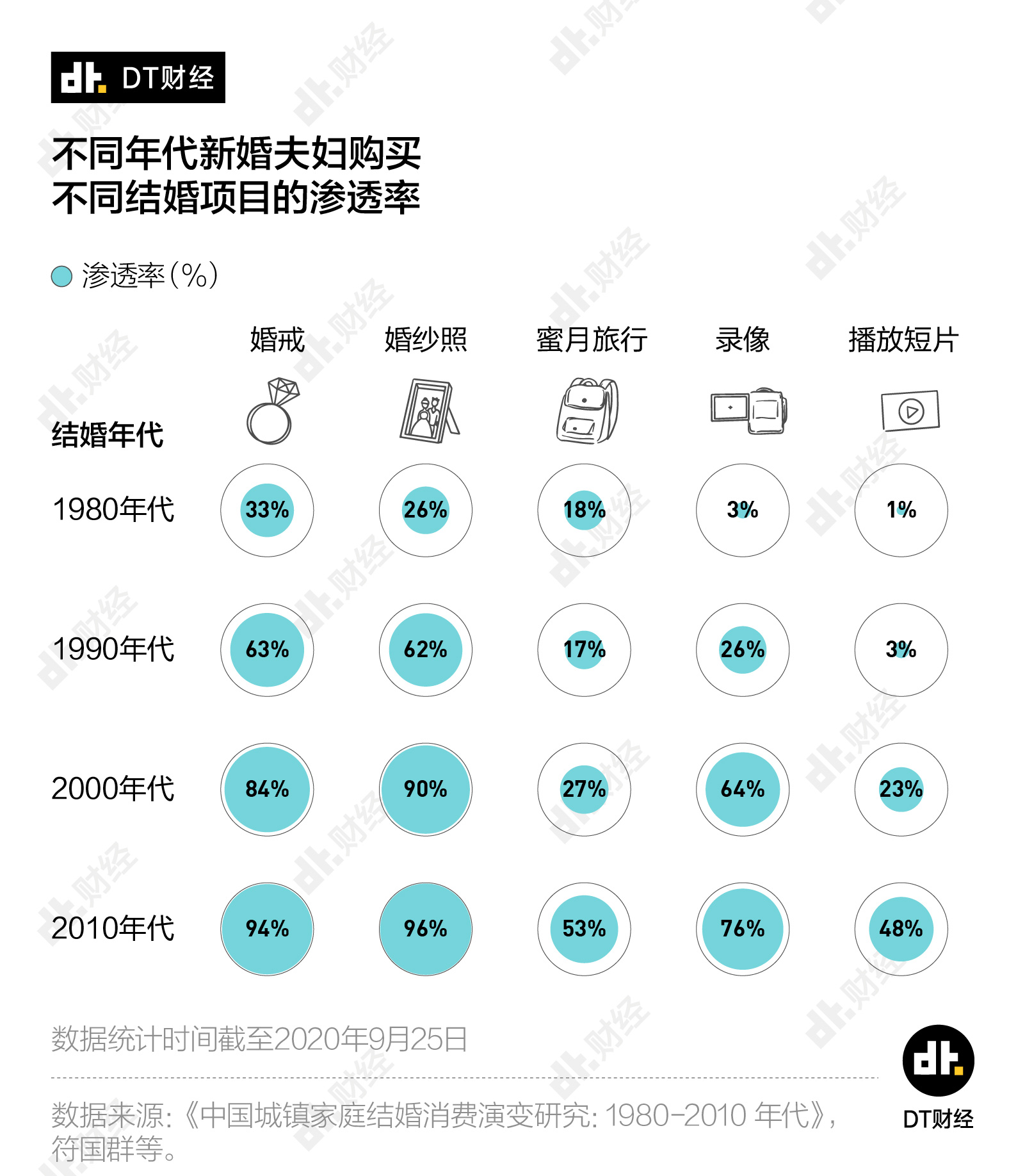 根据《中国城镇家庭结婚消费演变研究:1980-2010 年代》的调查数据,从1980年代到2010年代,在结婚消费项目中,录像的渗透率从80年代的3%飙升至如今的76%,播放短片的渗透率从1%上升至48%。