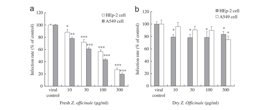 许多人患感冒或流感后,会使用生姜来帮助恢复。但此前这种疗法缺乏临床证据证实。2013年,有人研究了新鲜生姜和干姜对人类细胞中呼吸道病毒的影响。结果表明,新鲜生姜可能有助于保护呼吸系统,而干姜则没有类似效果。