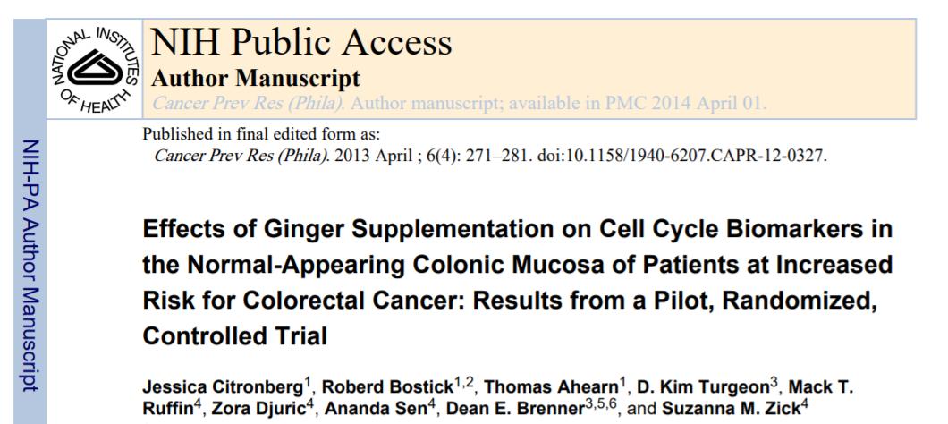 在2013年的一项试验中,研究人员给20名结直肠癌高风险参与者服用2g生姜或安慰剂,持续28天。活检结果显示,食用过生姜的参与者健康结肠组织的负面变化较少,提示生姜可以起到预防大肠癌的作用。
