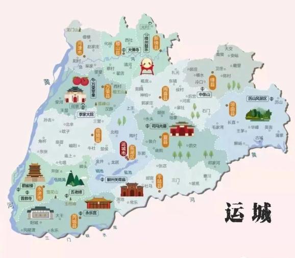 运城因“盐运之城”得名,这里有春秋商人猗顿、三国名将关羽、初唐诗人王勃、中唐文人柳宗元、史学大家司马光、戏曲名家关汉卿等文武俊秀。境内有:鹳雀楼、解州关帝庙、芮城永乐宫等名胜古迹