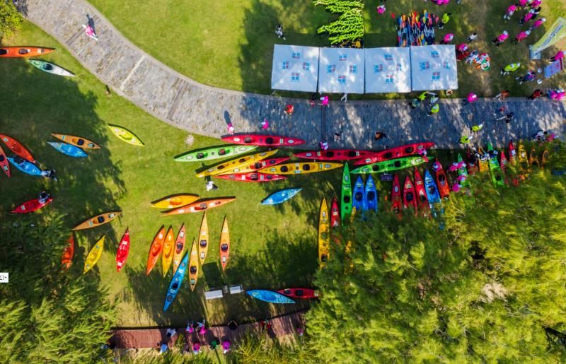 10月1日,开赛前的蓄势待发。城市摄影队 刘虹 摄今年夏天以来,摄影师应文曾在东湖岸边拍下了很多与东湖水相关的体育运动,桨板、跳东湖、家庭帆船赛……国庆中秋假期第一天,天气特别好,她拍下皮划艇划过东湖水面,无人机俯瞰绿草地上五颜六色的皮划艇,“像打翻了的调色板,好看极了!”