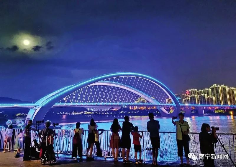 夜色下的邕江流光溢彩,吸引游客前来观光欣赏。记者 梁枫 摄10月2日晚,中央广播电视总台播出了南宁璀璨的灯光秀夜景。五象新区的高层楼宇灯光既具科技感又时尚,老南宁·三街两巷历史文化街区的夜景灯光则充满节日喜庆氛围。传统与现代的夜景灯光相互辉映交织,让南宁的夜晚呈现迷人的意境。