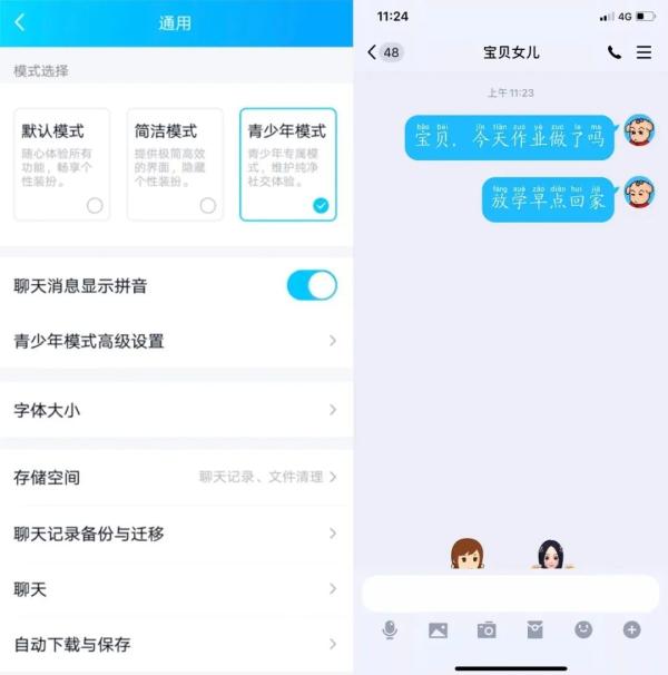 开启青少年模式后的QQ是怎样的呢?聊天显示拼音