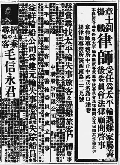 《申报》报道“太平轮寻人启事及章士钊出任太平轮善后委员会法律顾问”