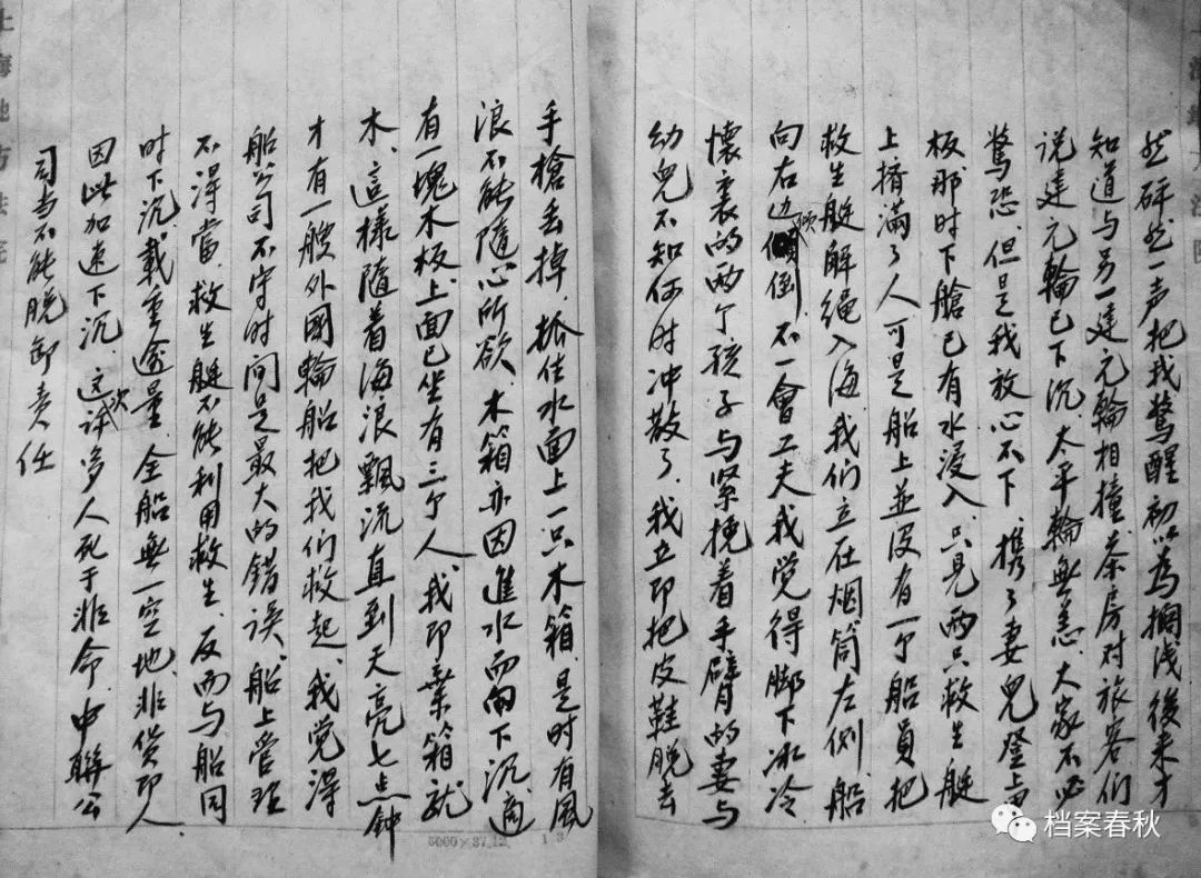 “……(我)携了妻儿登上甲板,那时下舱已有水浸入,只见两只救生艇上挤满了人,可是船上并没有一个船员把救生艇解绳入海。我们立在烟筒左侧,船向右边倾倒,不一会工夫我觉得脚下冰冷,怀里的两个孩子与紧挽着手臂的妻与幼儿不知何时冲散了。我立即把皮鞋脱去,手枪丢掉,抓住水面上一只木箱,是时有风浪,不能随心所欲,木箱亦因进水而下沉,适有一块木板,上面坐有三个人,我即弃箱就木。这样随着海浪漂流,直到天亮七点钟才有一艘外国轮船把我们救起……”