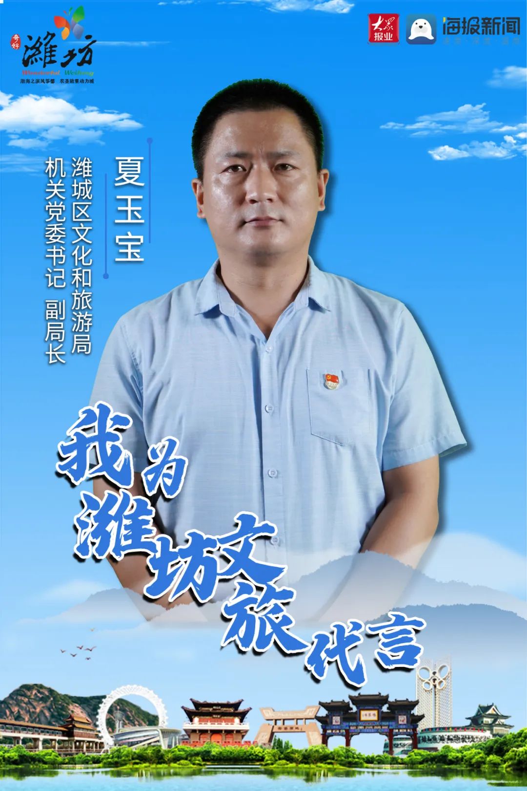 渤海之滨风筝都,农圣故里动力城!我是潍城区文旅局夏玉宝,我为潍坊文旅代言,我为潍城文旅代言。潍城历史悠久,文化旅游资源丰富,素有“南苏州北潍县”美誉。区内十笏园、万印楼等名胜古迹众多;白浪河、浮烟山等自然风光秀丽;核雕、仿古铜等特色工艺精湛;潍县萝卜、小磨香油等特产丰富;鸡鸭和乐、肉火烧等地方小吃风味独特。这个夏天,我们为您准备了寻根仿古游、红色研学游、山水田园游、非遗体验游等众多旅游线路,热情好客的潍城人民欢迎您的到来,我在潍城等你!