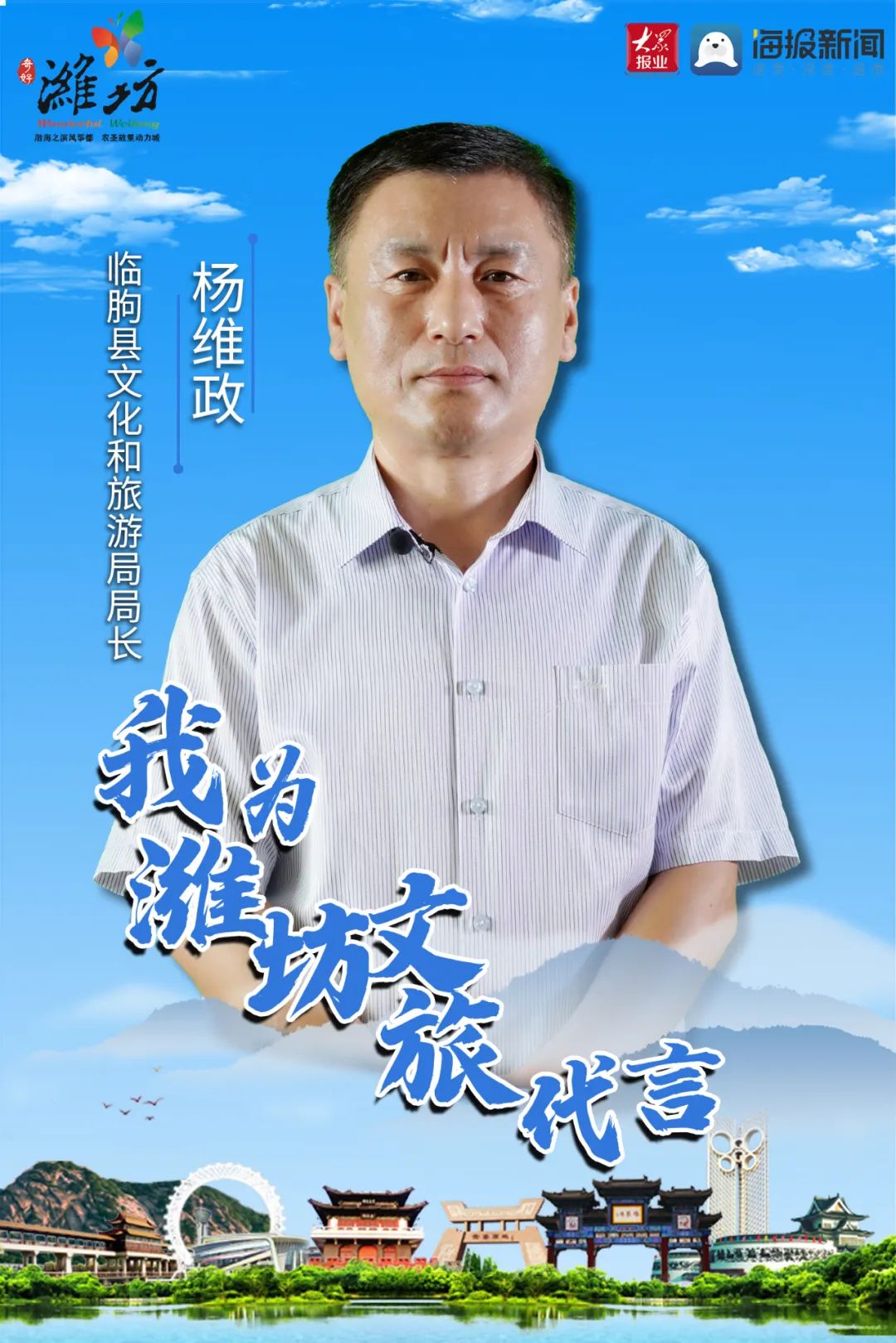 渤海之滨风筝都,农圣故里动力城。我是临朐县文化和旅游局局长杨维政,我为潍坊文旅代言,我为临朐文旅代言。临朐县是中国最佳生态旅游县、全国文化模范县、山东省全域旅游示范区。