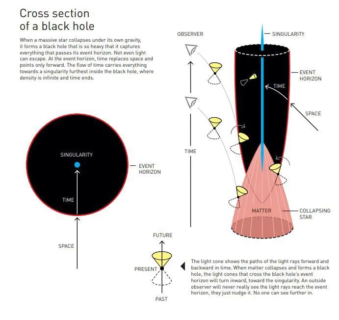 罗杰·彭罗斯使用了巧妙的数学方法证明,黑洞是爱因斯坦广义相对论的直接结果。不过爱因斯坦本人并不相信黑洞真的存在。黑洞是宇宙中质量巨大的怪物,会捕获落入其半径内的所有物质,没有东西可以逃脱黑洞的引力束缚,即便是光。