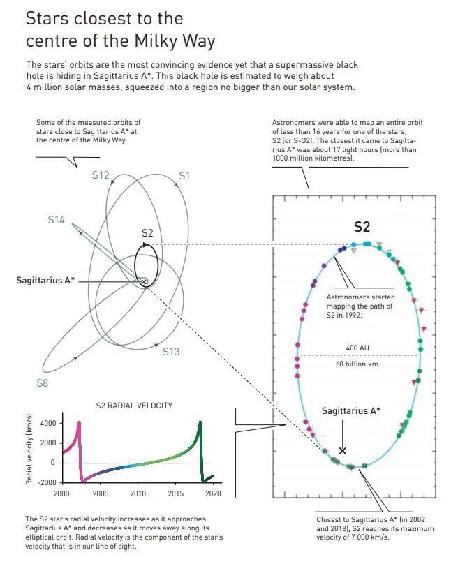 莱因哈德·根泽尔和安德里亚·盖兹通过探测恒星环绕中心黑洞的周期来推断中心黑洞的质量。他们各自领导了一个天文学家小组,从上世纪90年代初开始,他们就致力于研究银河系中心一个名为人马座A*的区域。距离银河系中心最近、最亮的那些恒星的轨道被越来越精确地绘制出来。两个研究小组的测量结果一致,他们都发现有一个质量非常大的不可见物体,它牵引着这一团恒星,使它们以令人眩晕的速度四处乱窜。在一个不比我们的太阳系更大的区域里,聚集着大约400万个太阳质量的物质。