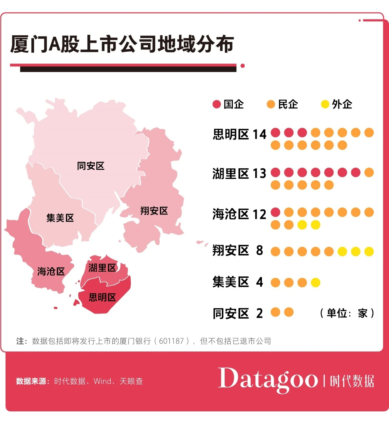 厦门市的思明区和湖里区作为最早发展的区域,拥有了最多的上市公司。据时代数据统计,在53家上市公司中,就有14家位于思明区、有13家位于湖里区,其中,国企主要集中在湖里区、民企主要集中在思明区。此外,海沧区也拥有12家上市公司。