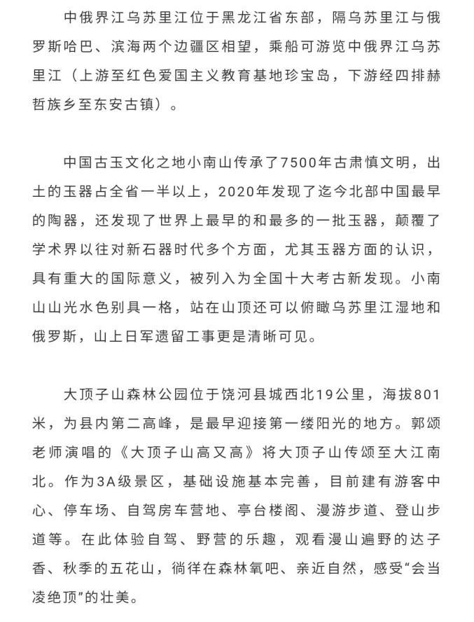 边塞乡村风情之旅中俄界江乌苏里江—小南山(中国古玉文化之地)—大顶子山森林公园(徜徉森林氧吧)—四排赫哲族民族乡(感受赫哲民俗风情)—小南河关东民俗旅游摄影基地