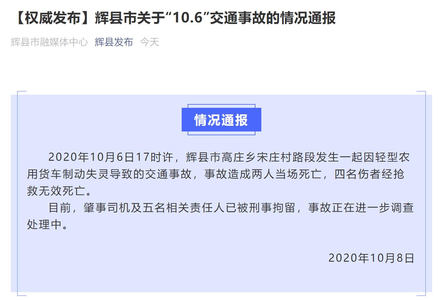 据河南省新乡市“辉县发布”微信公众号消息,10月6日17时许,辉县市高庄乡宋庄村路段发生一起因轻型农用货车制动失灵导致的交通事故,事故共造成六人死亡,其中两人当场死亡,四名伤者经抢救无效死亡。