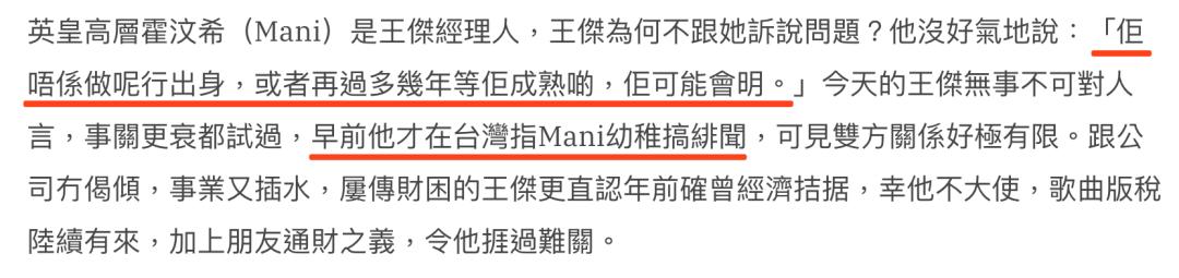 王杰1999年以天王之势加盟英皇,属于很早的开山元老,但当时他已经36岁,显然没有把年轻的霍汶希当回事,对于很多事情不服她的管束。他曾经说过在音乐方面,霍汶希“不是做这行出身,再多几年等她成熟或许会明白”。