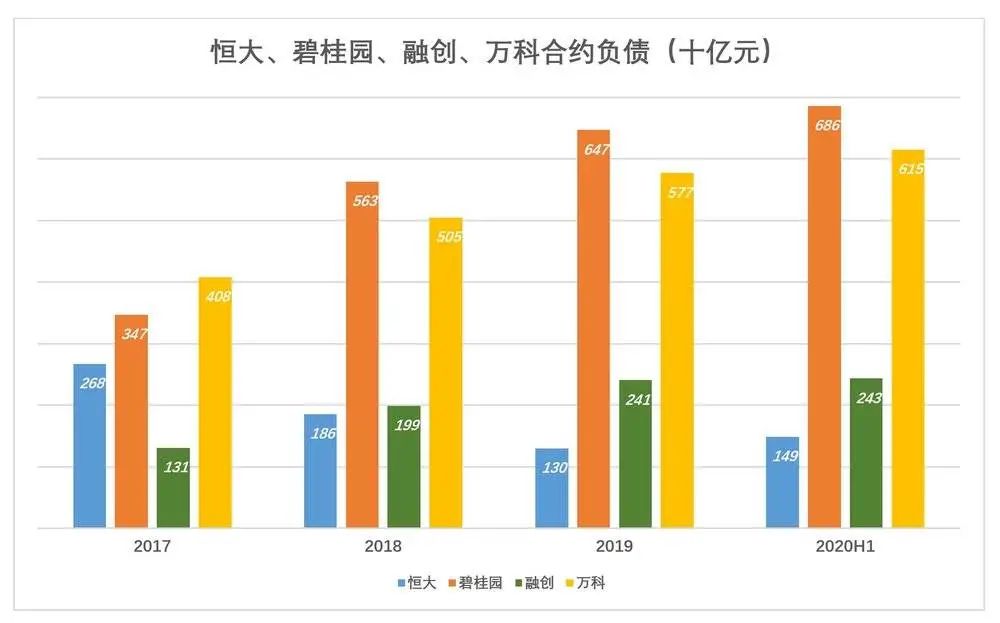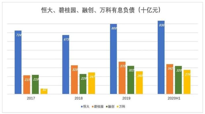 截至2020年6月末,恒大有息负债高达8355亿,分别是碧桂园、融创、万科的241%、261%、303%。
