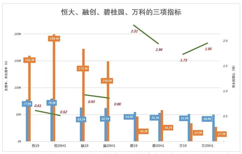 截至2020年6月末,恒大负债总额为1.98万亿,客户预付款(即合约负债)为1486亿,总资产2.3万亿。“剔除预付的资产负债率”为79.8%,踩线!#红线要求不大于70%#