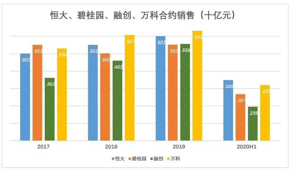 以合约销售面积而论,2019年的冠军是碧桂园,达6237万平米。但单价8854元/平米,远低于万科,因此合约销售金额只有5522亿。2020年H1,碧桂园合约销售面积被更急迫的恒大超越,销售金额、均价分别为2670万和8381元/平米。