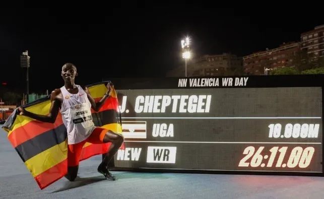 切普特盖(新华社发)北京时间8日凌晨,在一场名为NN瓦伦西亚世界纪录日的活动中,乌干达24岁长跑天才切普特盖以26分11秒00打破男子10000米世界纪录。同一天,埃塞俄比亚的吉迪以14分06秒62创造了女子5000米新的世界纪录。