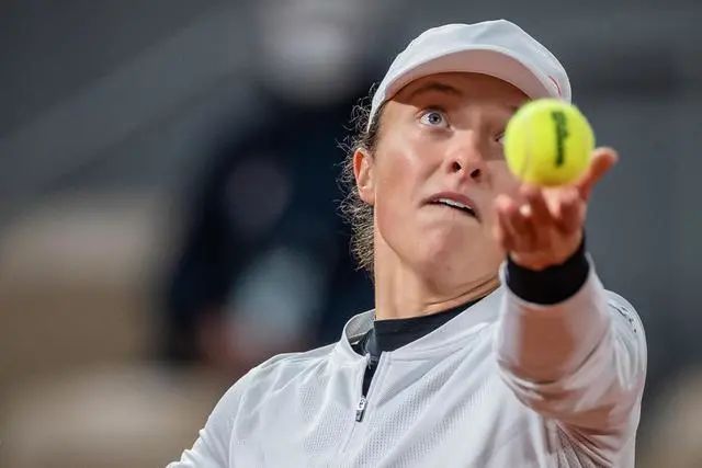 斯维亚特克在比赛中发球(新华社发)北京时间8日,2020年法网女单半决赛开启争夺。在率先进行的一场黑马大战当中,波兰19岁新星斯维亚特克对决阿根廷选手波多隆斯卡。斯维亚特克延续自己的神勇状态,以总比分2-0横扫对手,首次杀进大满贯女单决赛。