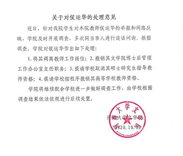 10月7日,河南大学文学院在河南大学的微信公众号发布《情况通报》。该通报公布了河南大学文学院《关于对侯运华的处理意见》。