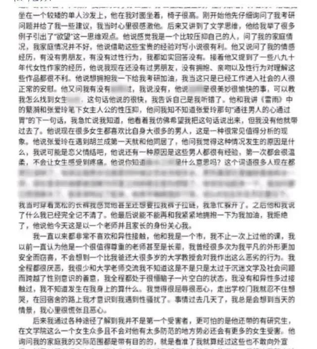 该女生称,教授先是询问了她的考研情况,让她很感激。随后,用文学思维引出很多例子引出“欲望”观点,还问女生有没有男朋友,有没有性行为。还表示,她到目前都没有男朋友和性行为,没有拥抱、亲吻等,对理解文学作品很不利。