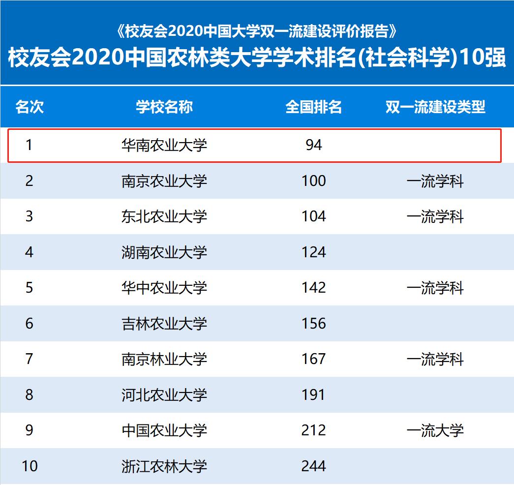 2020年10月7日,全国第三方大学评价研究机构——艾瑞深校友会网(Cuaa.Net)正式发布《校友会2020中国大学双一流建设评价报告》,报告发布最新校友会2020中国大学学术排名、2020中国各类型大学学术排名和2020中国农林类大学学术排名等榜单。华南农业大学在“2020中国农林类大学学术排名(自然科学)”排名第5,在“2020中国农林类大学学术排名(社会科学)”排名第1,雄居2020中国农林类非双一流大学学术排名(自然科学)和2020中国农林类大学学术排名(社会科学)冠军,是下一轮世界一流学科建设高校的最有力竞争者。