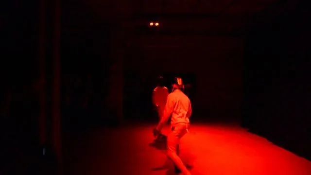 两年前,杰克·戈尔茨坦在日内瓦的萨尔帕蒂诺(Salle Patino)表演了《两名击剑手》(Two Fencers)。在距观众席约五十英尺处,伴随好莱坞侠盗录音带中的音乐,两名击剑手在聚光灯的暗红色光线下格斗。[6]他们仿佛似曾相识、相隔遥远的幽灵,但又确实在场(present)。类似戈尔茨坦早先表演中的柔术演员、体操运动员,他们在那里,在观众面前表演,却像虚拟的、无形的、生动却模糊的全息影像。在一名击剑手击败另一名击剑手后,聚光灯熄灭,但表演仍在继续;二人在黑暗中聆听回放的背景音乐,观众尝试回想已成记忆的击剑场面。在依靠记忆经验的加倍效果中,形成了记忆发挥作用的悖论机制:影像被遗忘、被替换。[《罗热辞典》(Roget’s Thesaurus)如此孩童式地定义记忆:“我遗忘的事情。”]