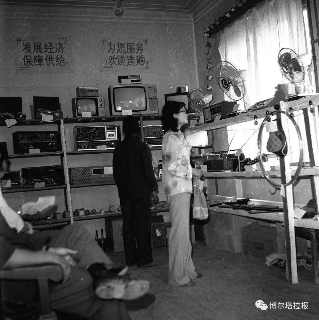 1982年的商品样品室(上世纪70年代,百元级“老四件”是自行车、手表、缝纫机、收音机;80年代,“新三件”是彩电、冰箱、洗衣机)