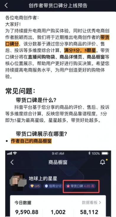 杜飞透露,抖音小店也将推出“带货口碑分”,分数将通过商品评价、售后、投诉等方面综合计算,并在直播间购物车、商品详情、商品橱窗等位置展示,“分数越高,带货资源倾斜越多,和淘宝越来越像了”。