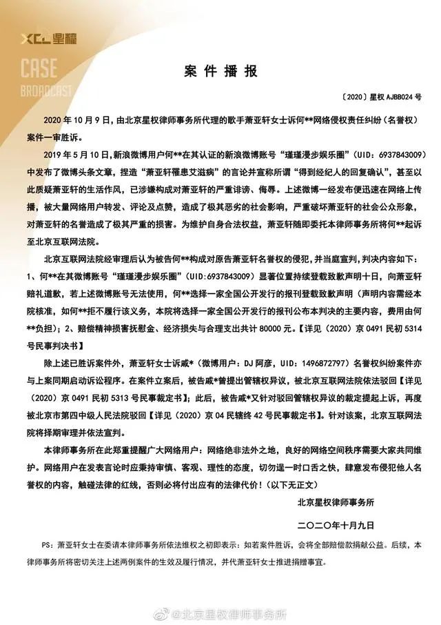 据悉,萧亚轩此前曾委请律师事务所,如若案件胜诉,会将全部赔偿款捐献公益。