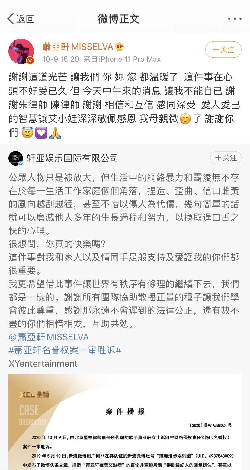 官司胜诉后,萧亚轩在微博表示了对大家的感谢,“谢谢这道光芒……谢谢相信和互信……我母亲微笑了,谢谢你们。”