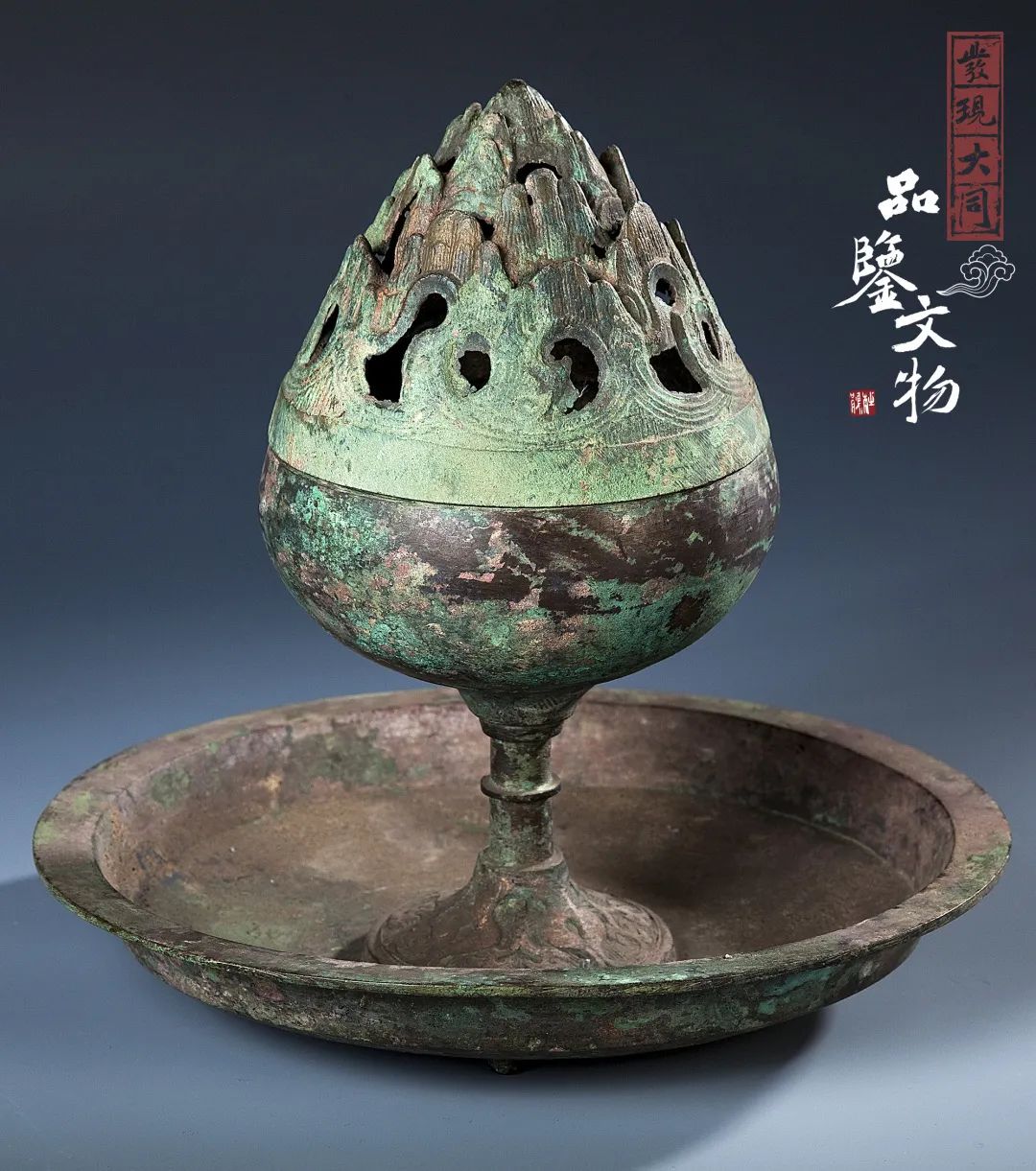 大同这件汉代博山炉由炉盖、炉身和底盘组成,盖镂空,呈山形,深腹,细柄,底盘为圆形。