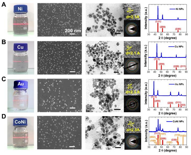 REDS方法适用于合成多种不同的金属基纳米材料,包括金属单质纳米颗粒(如Ag、Au、Ni、Cu)、合金纳米颗粒(如FeCoNi和FeCoNiW)和金属氧化物纳米材料(如Co3O4)等。
